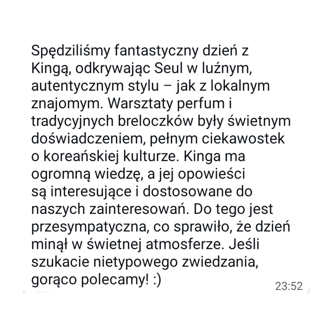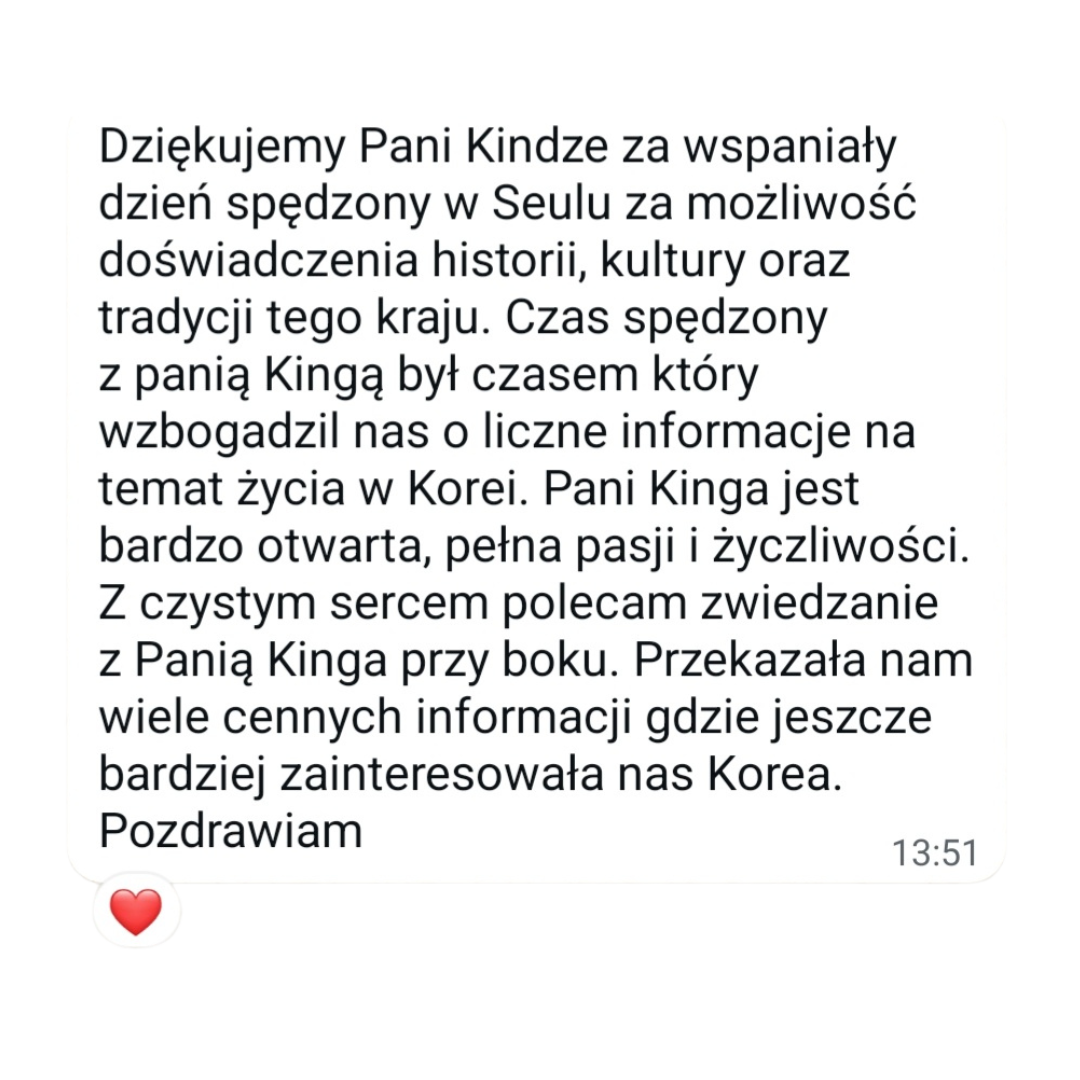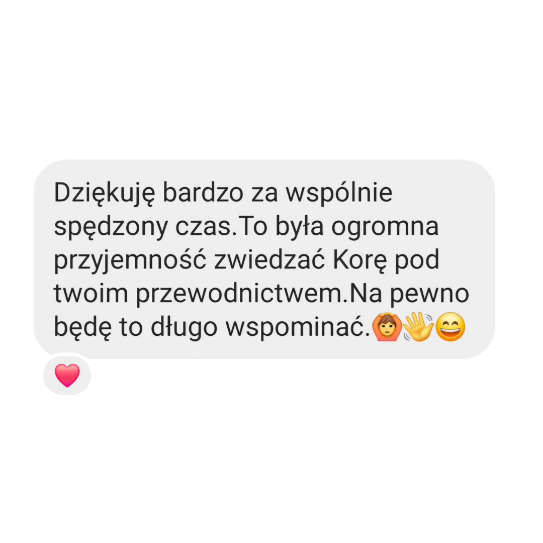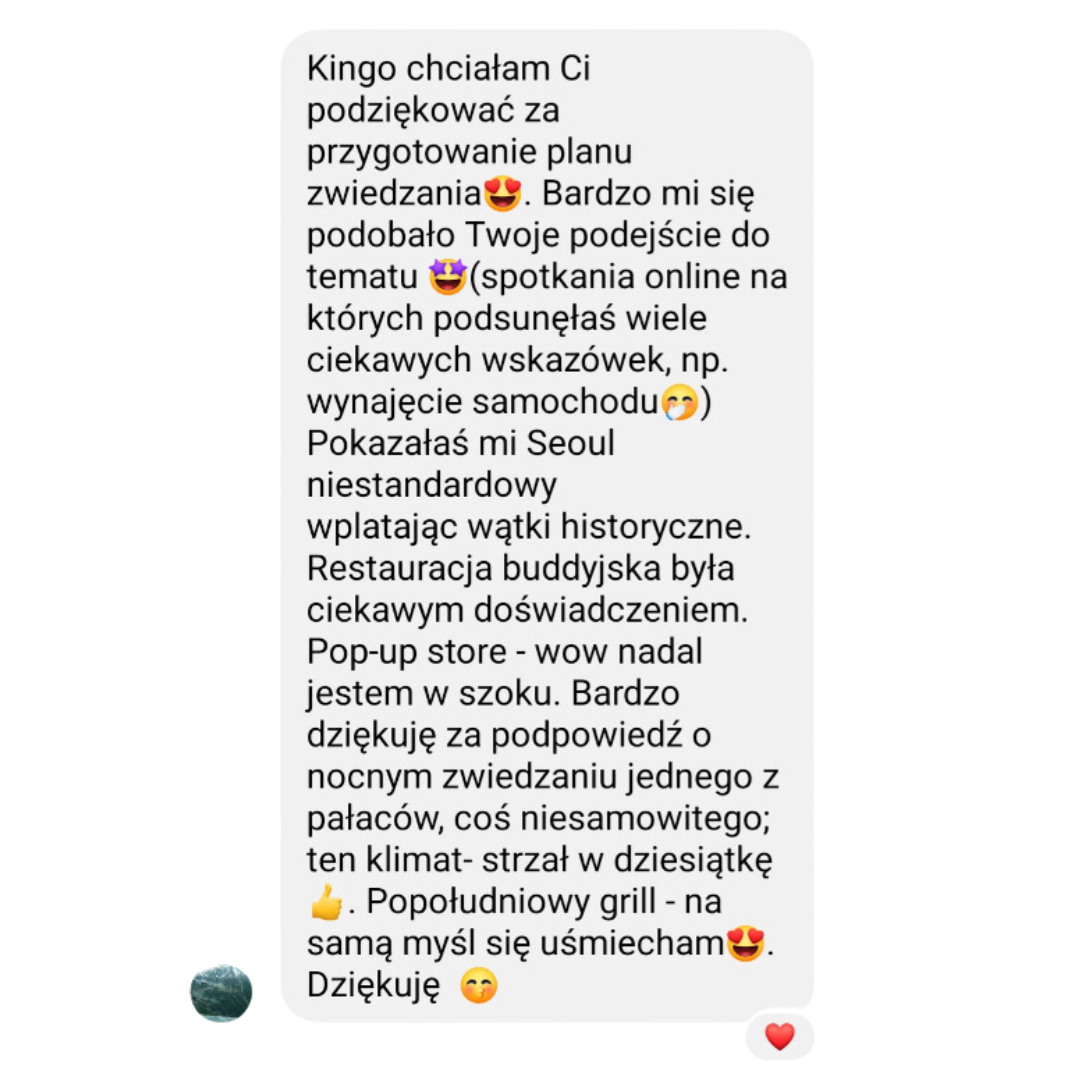 Równocześnie zajmuję się pomaganiem innym w tworzeniu spersonalizowanych planów podróży po Korei, uwzględniając nie tylko popularne miejsca, ale także te mniej znane, które często pozostają poza zasięgiem turystów. Jako przewodnik po Seulu prowadzę wycieczki, podczas których wspólnie odkrywamy ukryte, fascynujące zakątki miasta, które posiadają niezwykłą historię i unikalny klimat.