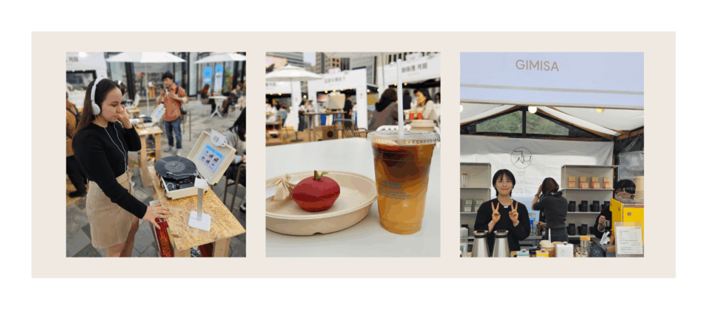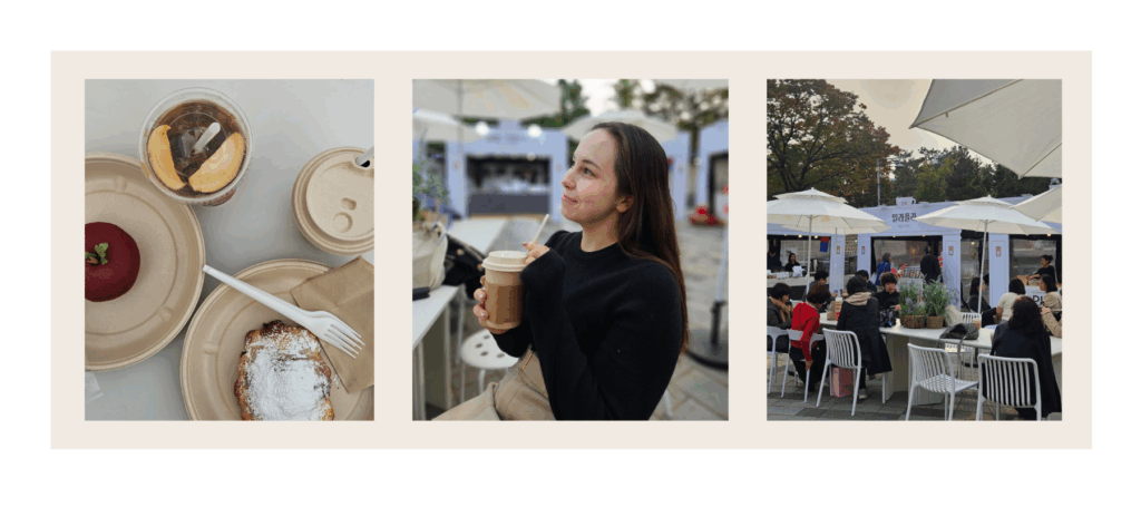 Wydarzenie odbywa się na otwartym rooftopie, więc klimat jest absolutnie niepowtarzalny. Wokół złote liście, ciepłe (jak na listopad!) temperatury, a dookoła stoły i stoiska kawiarni z całej Korei. Tak, nie tylko z Seulu – swoje stanowiska mają tu także marki z mniejszych miast, co daje szansę spróbowania czegoś zupełnie nowego i nieoczywistego.